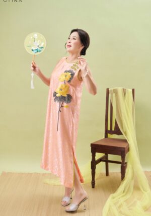 Đầm Hoàng Yến – tơ tằm sen vàng nền hồng