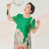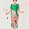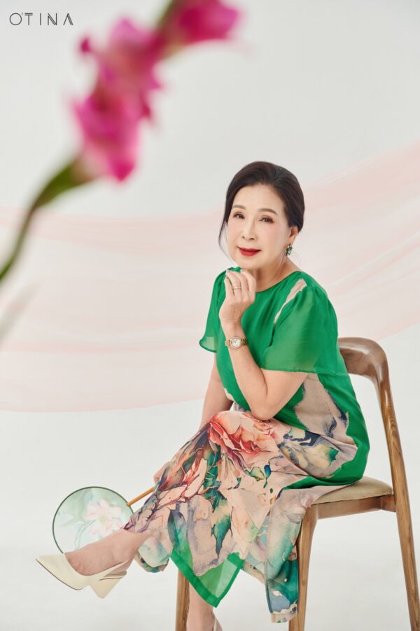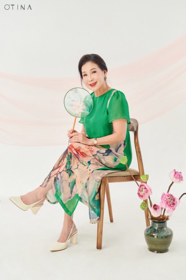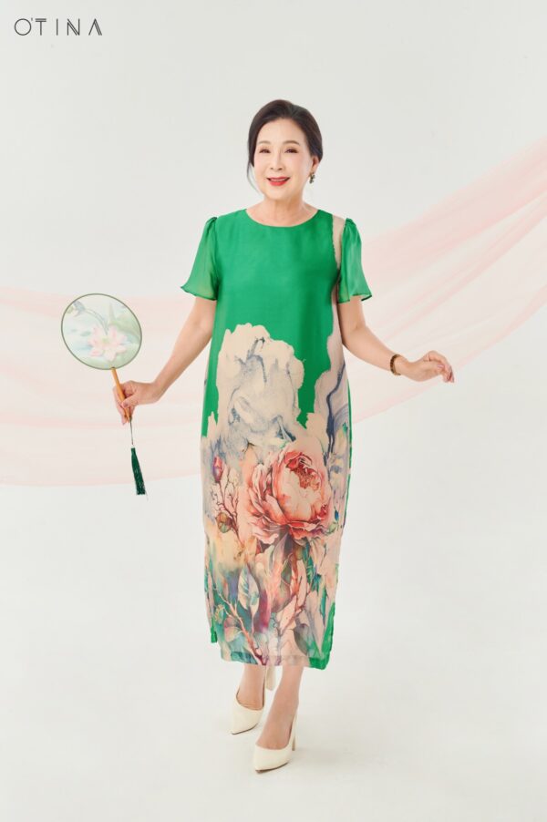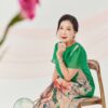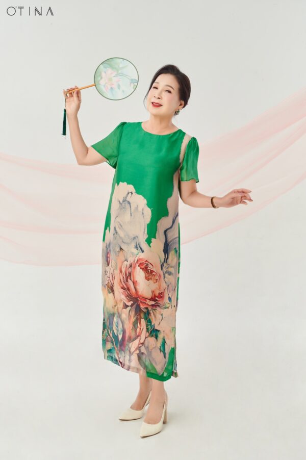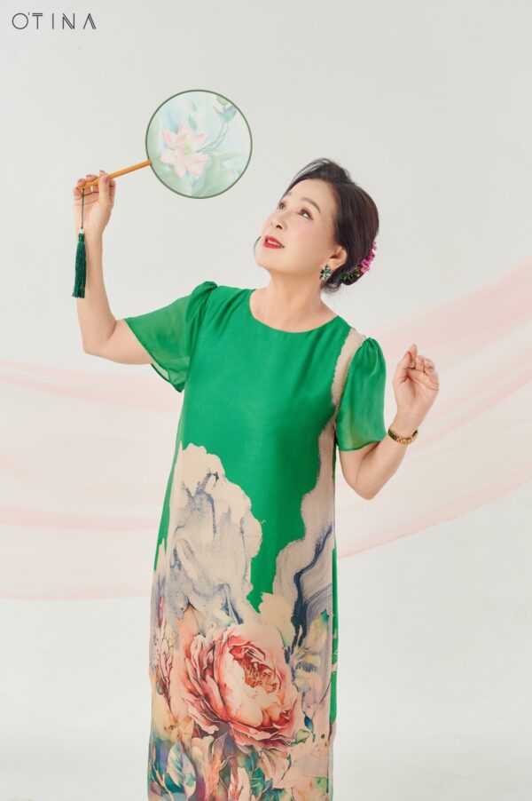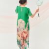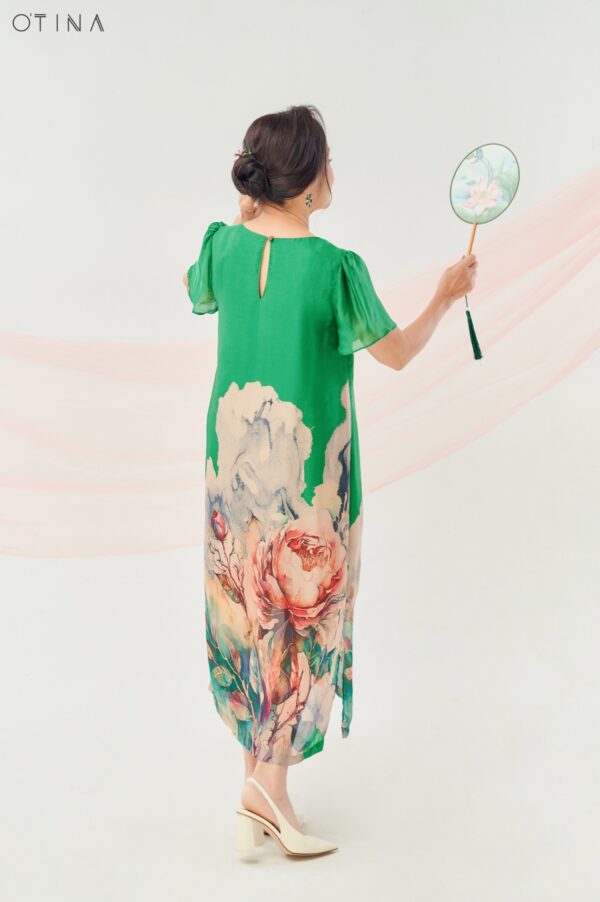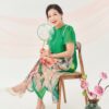 Đầm Đông Liên – lụa hoa hồng xanh lá là thiết kế nhẹ nhàng nhưng không kém phần nổi bật.