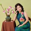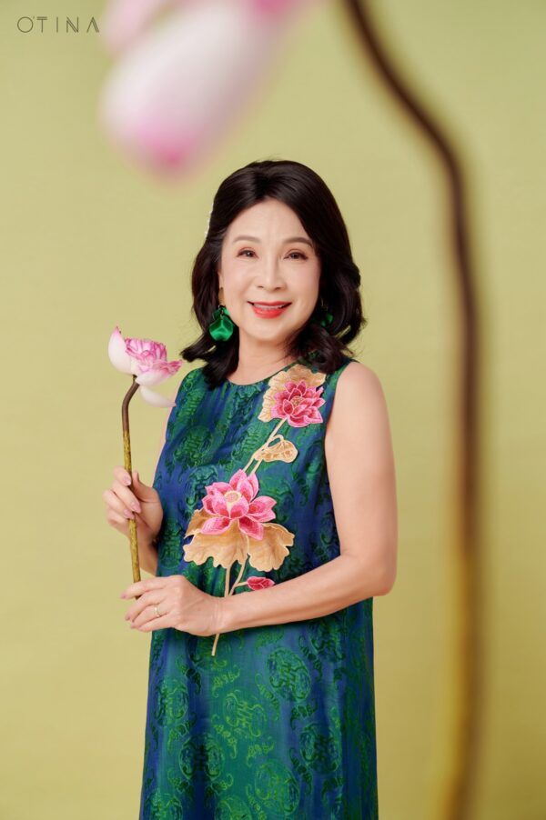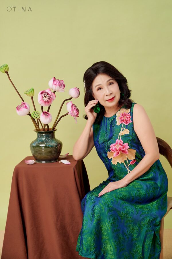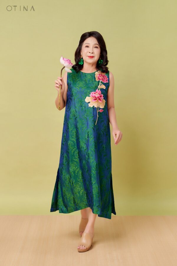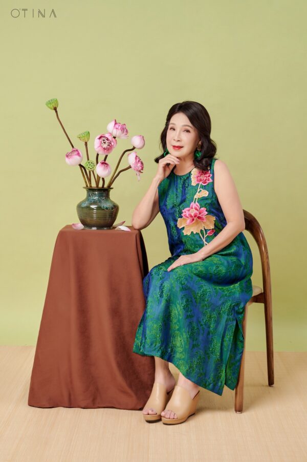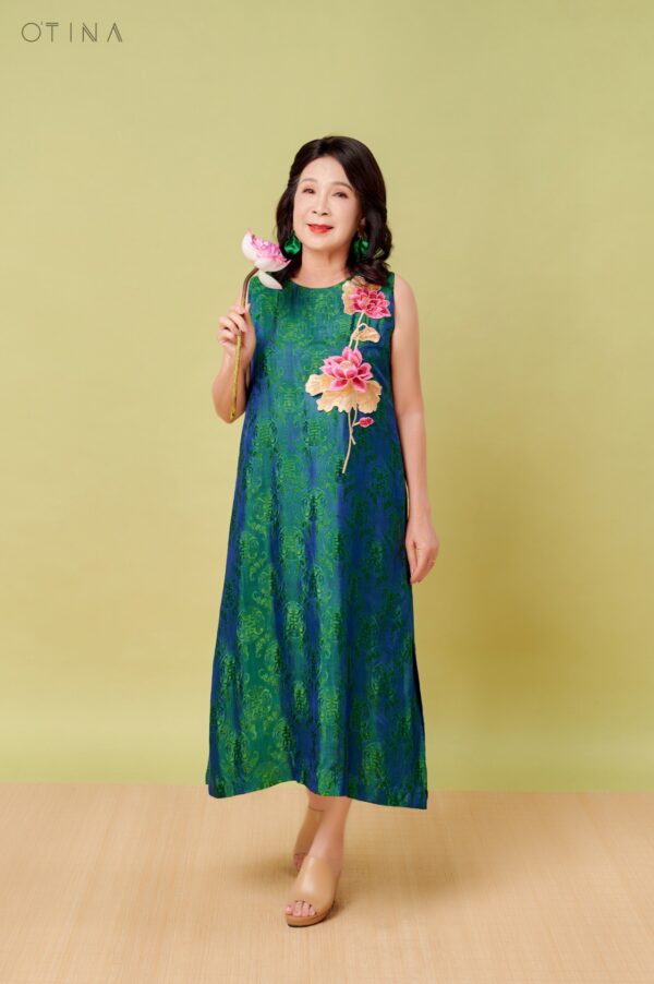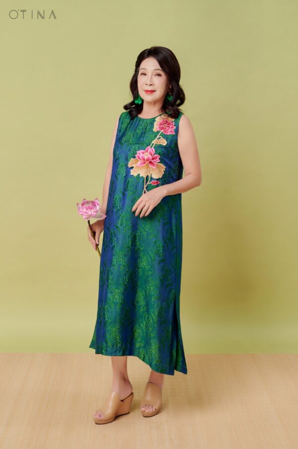 Đầm Đông Liên – lụa tơ tằm thọ dơi xanh hoa sen là thiết kế nhẹ nhàng nhưng không kém phần nổi bật.