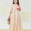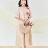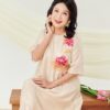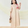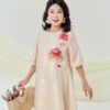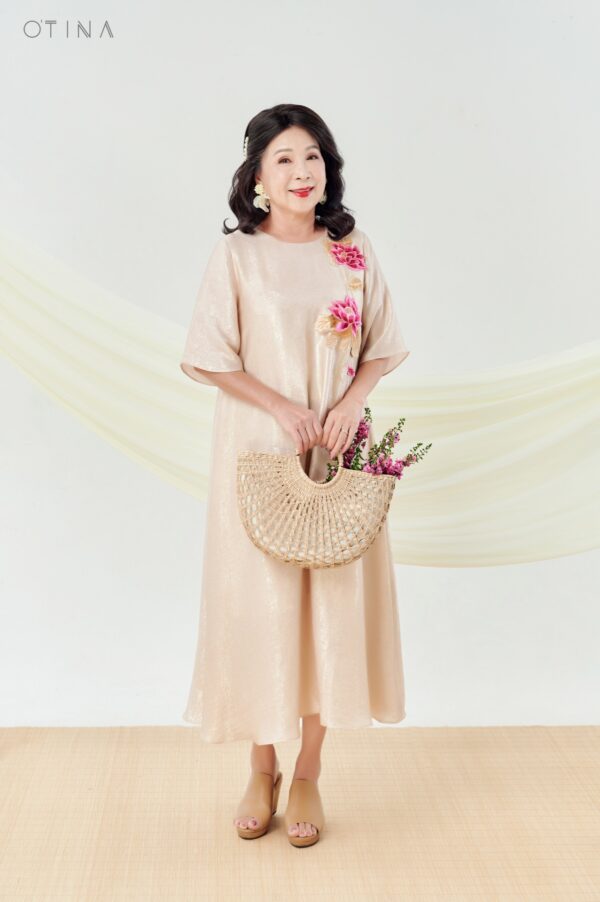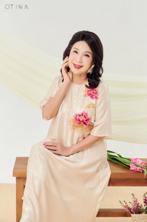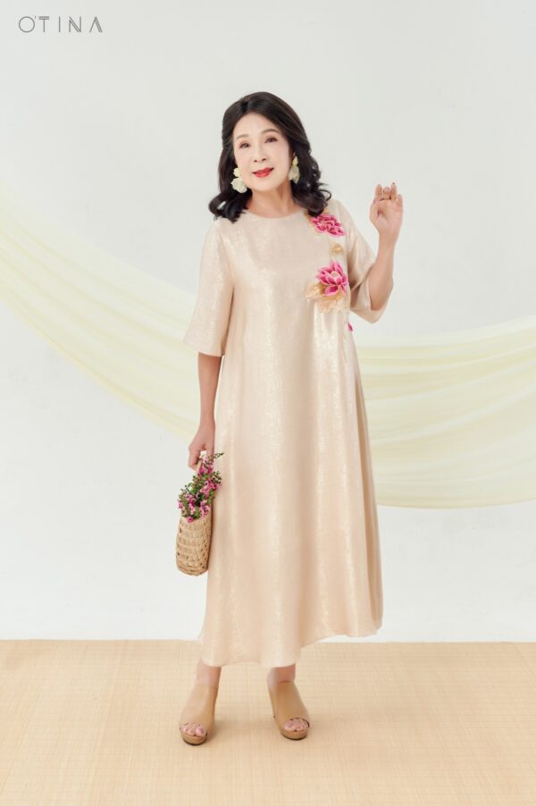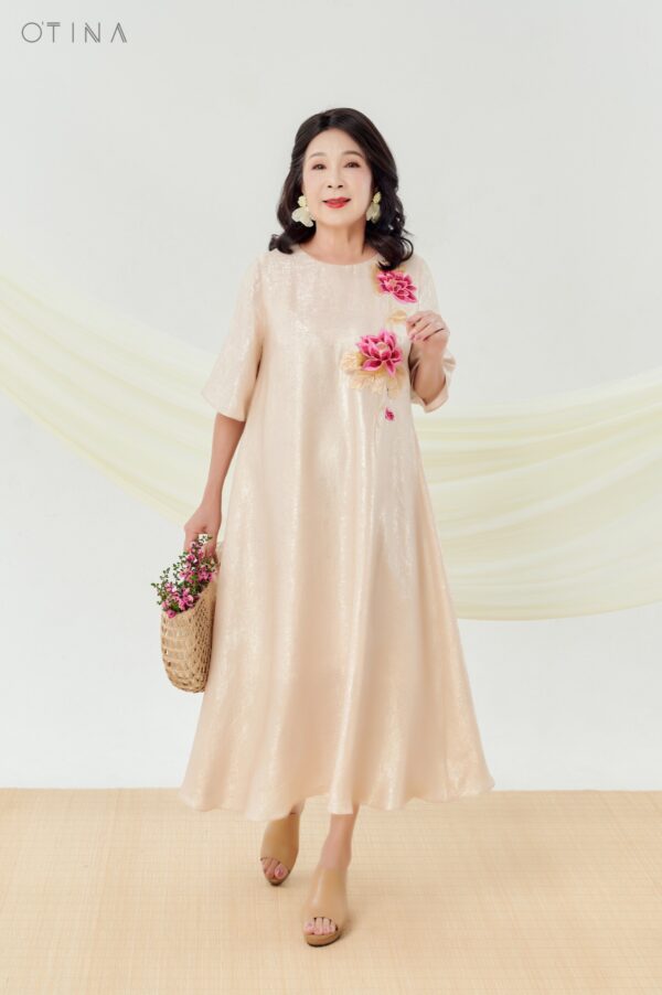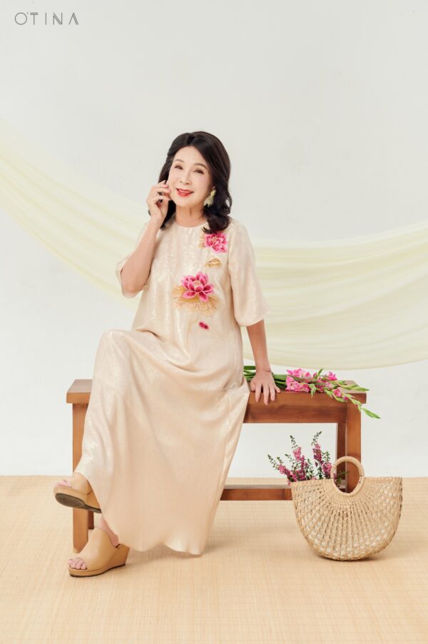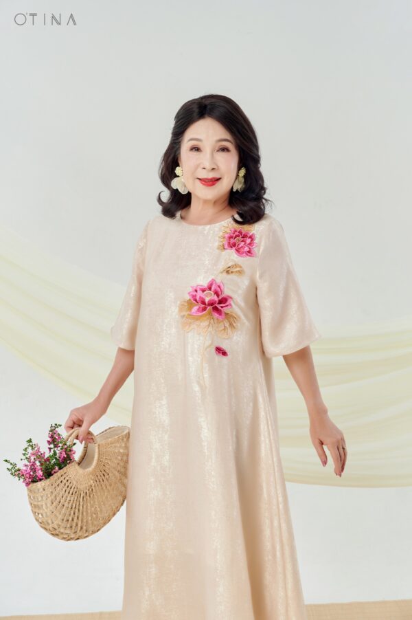 Đầm Đông Liên – nhung kim sa trắng sen hồng là thiết kế nhẹ nhàng nhưng không kém phần nổi bật.