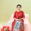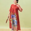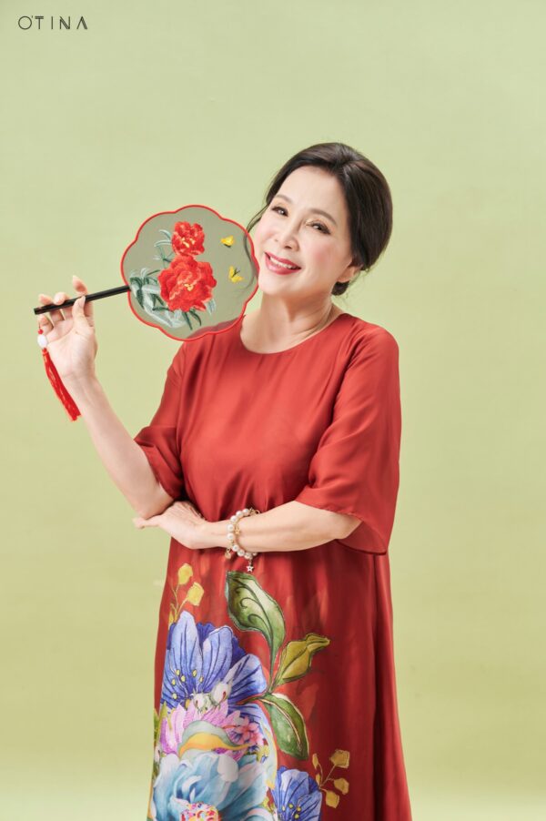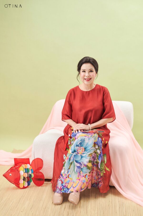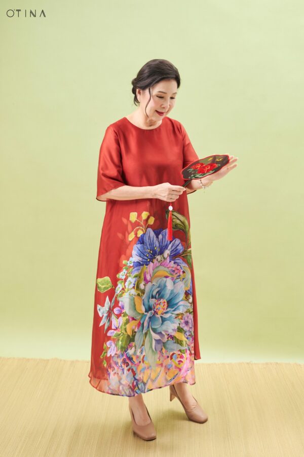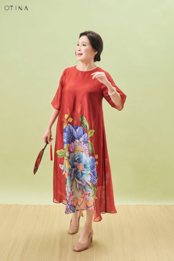 Đầm Hoàng Yến – tơ ngọc hoa đỏ là thiết kế nhẹ nhàng nhưng không kém phần nổi bật.