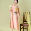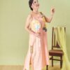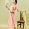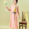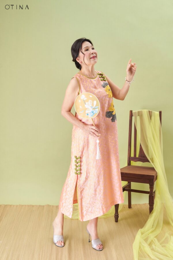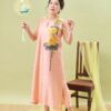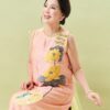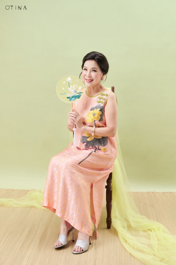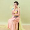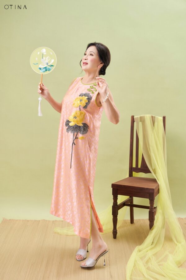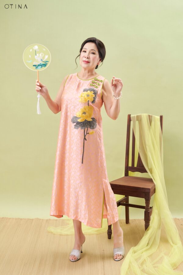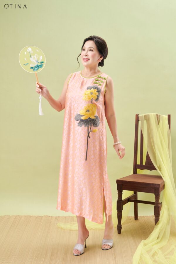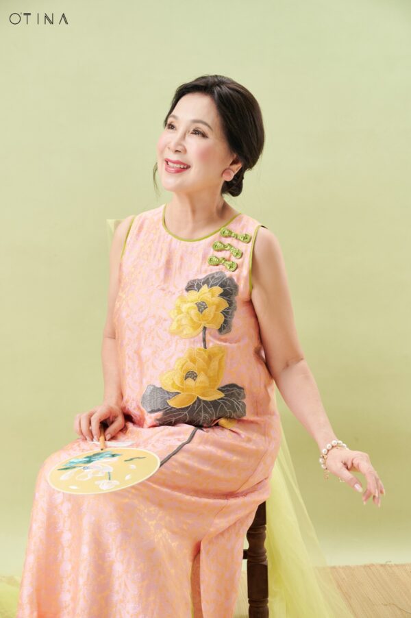 Đầm Hoàng Yến – tơ tằm sen vàng nền hồng là thiết kế nhẹ nhàng nhưng không kém phần nổi bật.