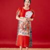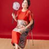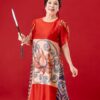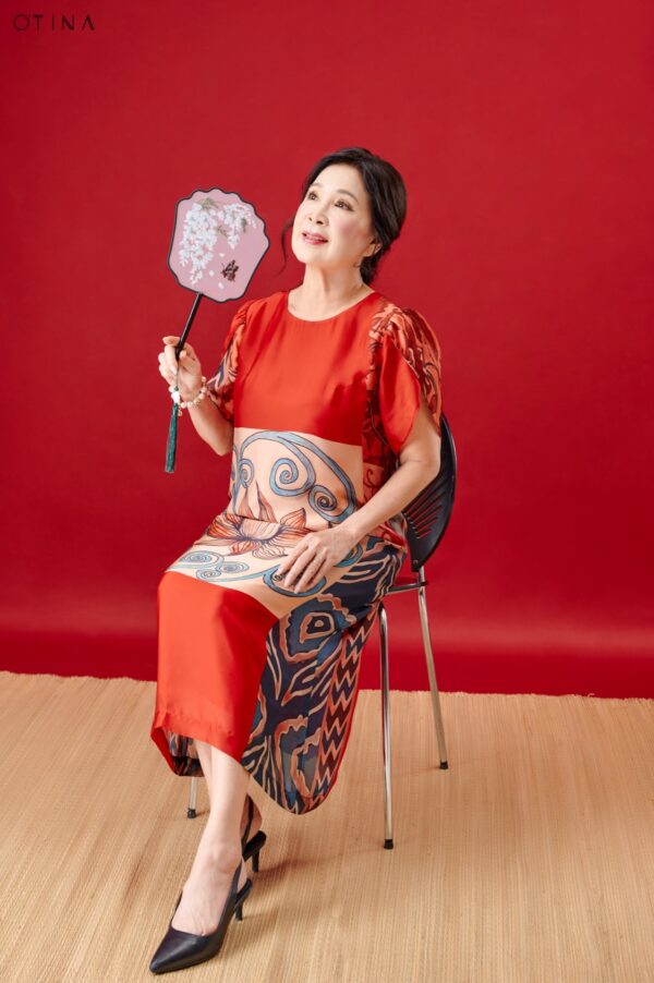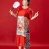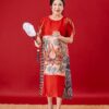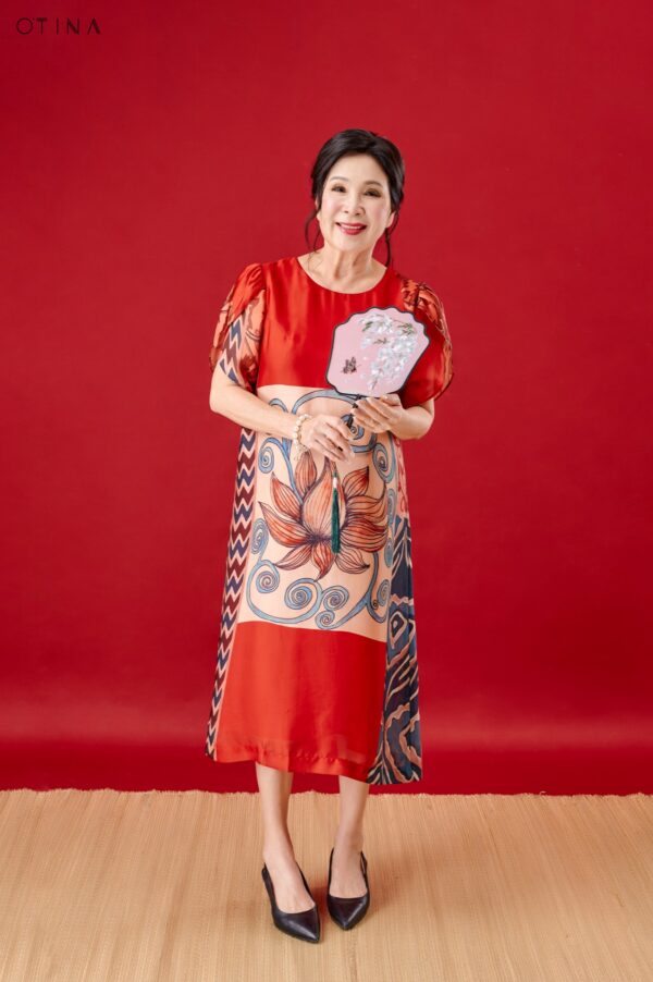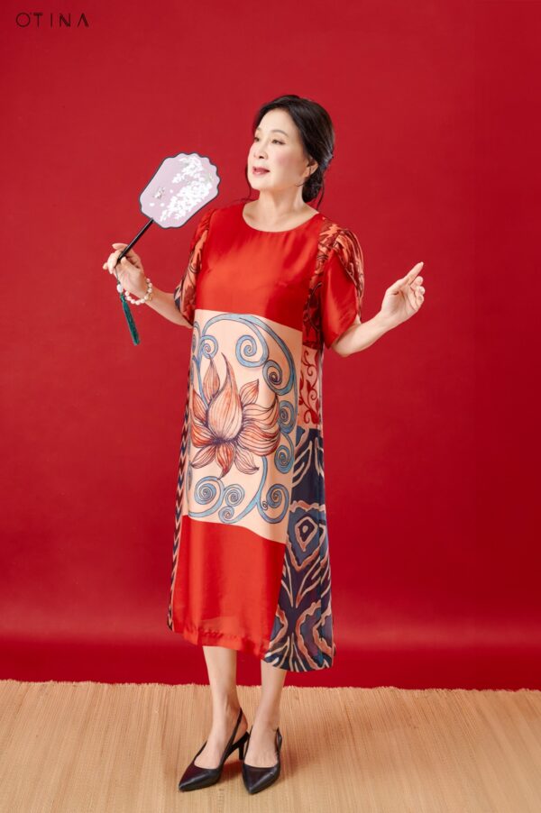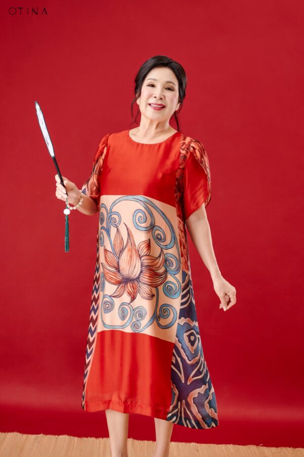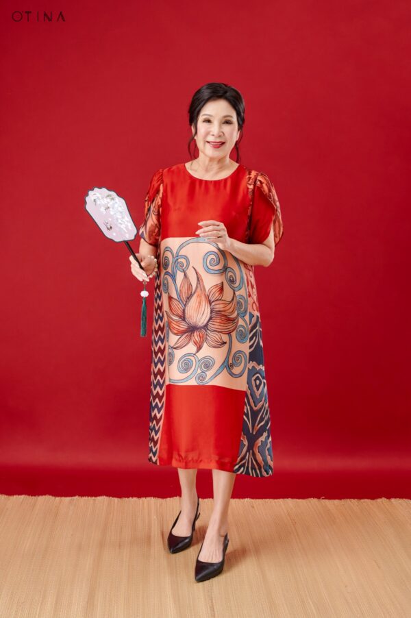 Đầm Hoàng Yến – tơ tằm sen vuông đỏ là thiết kế nhẹ nhàng nhưng không kém phần nổi bật.