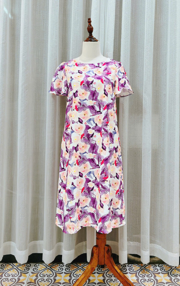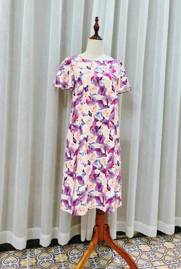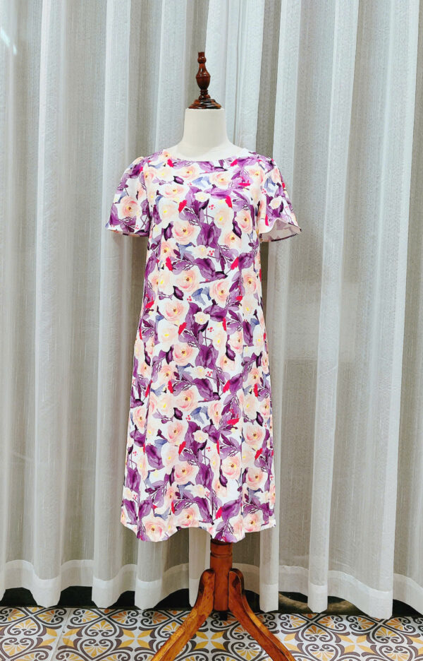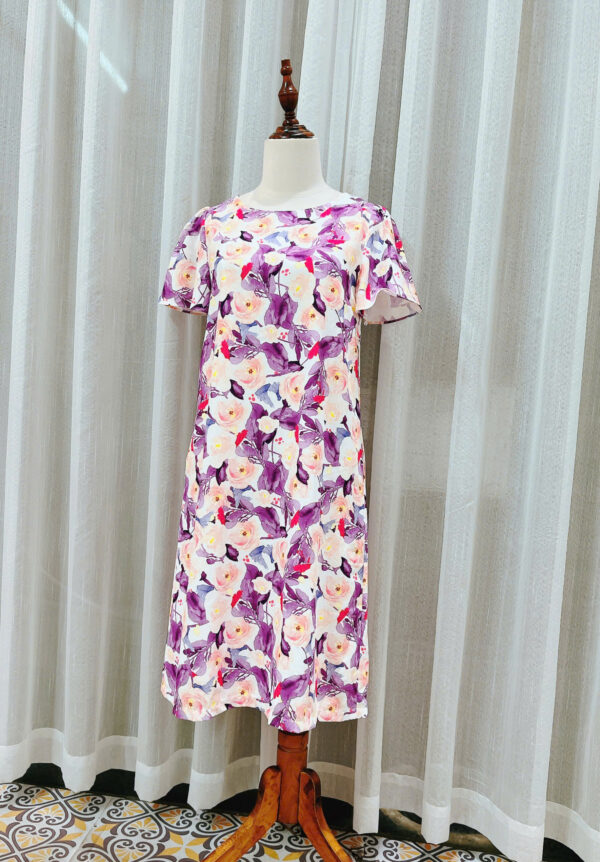 Đầm lụa hàn hoa tím là thiết kế nhẹ nhàng nhưng không kém phần nổi bật.