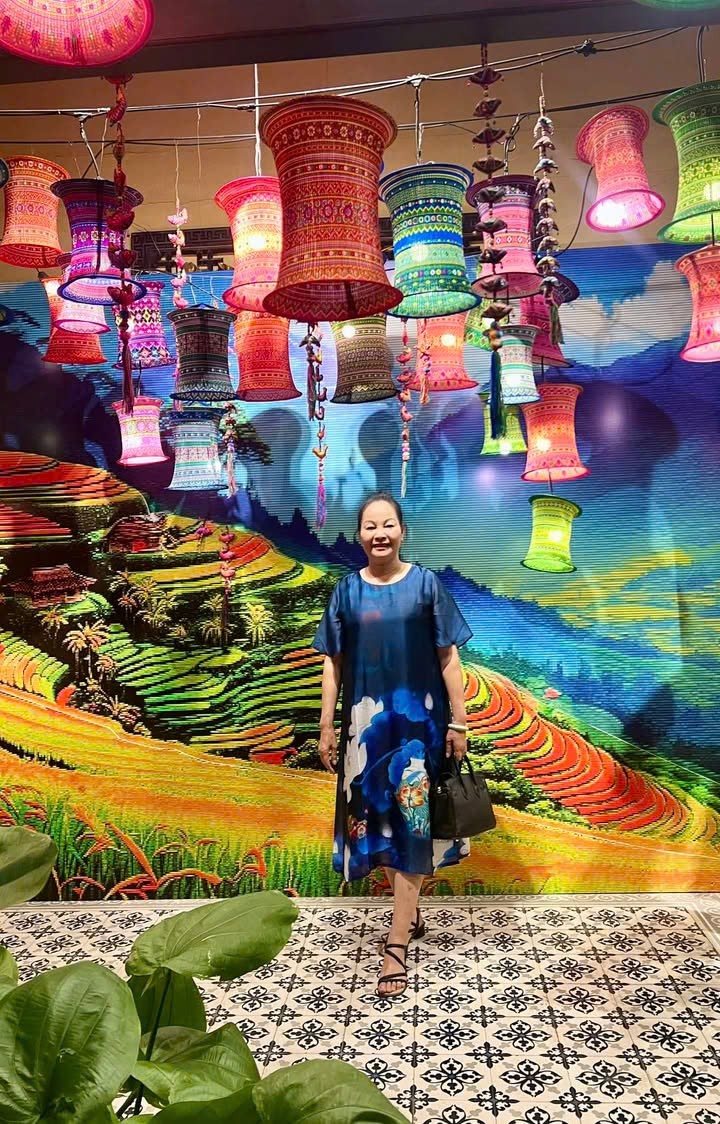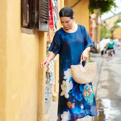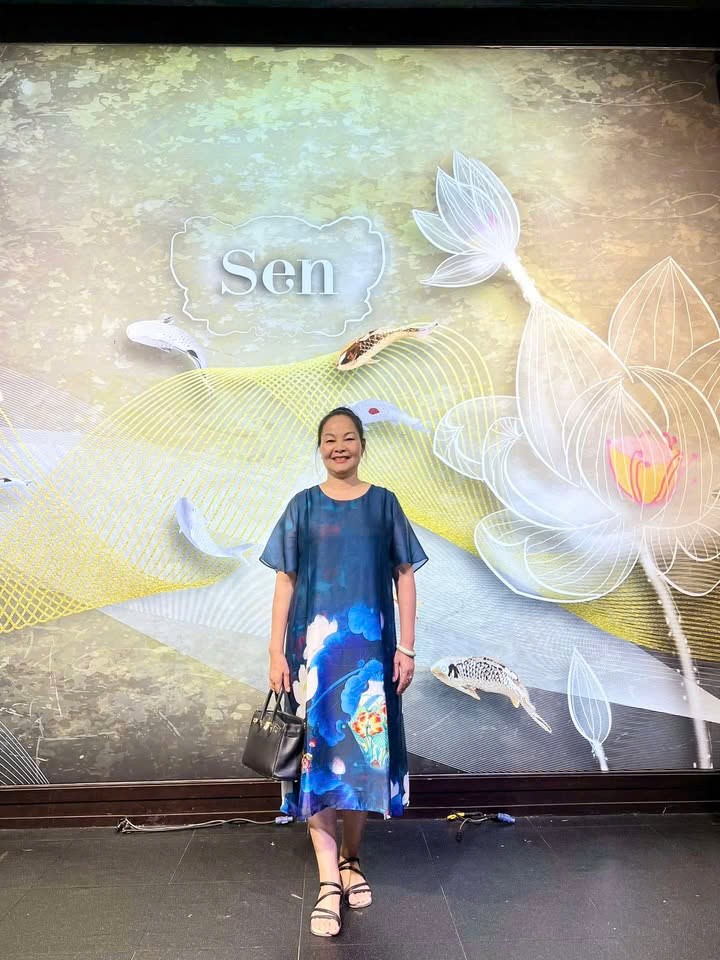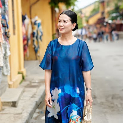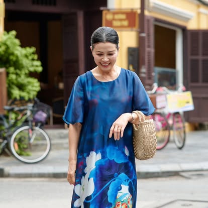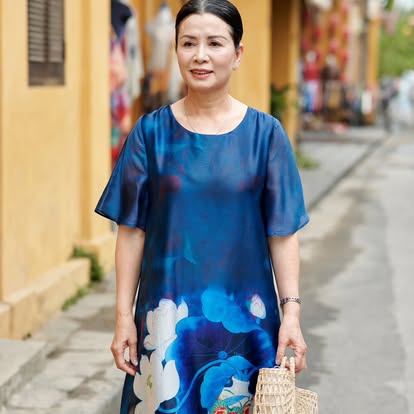 Đầm tơ sen xanh lam là thiết kế nhẹ nhàng nhưng không kém phần nổi bật.